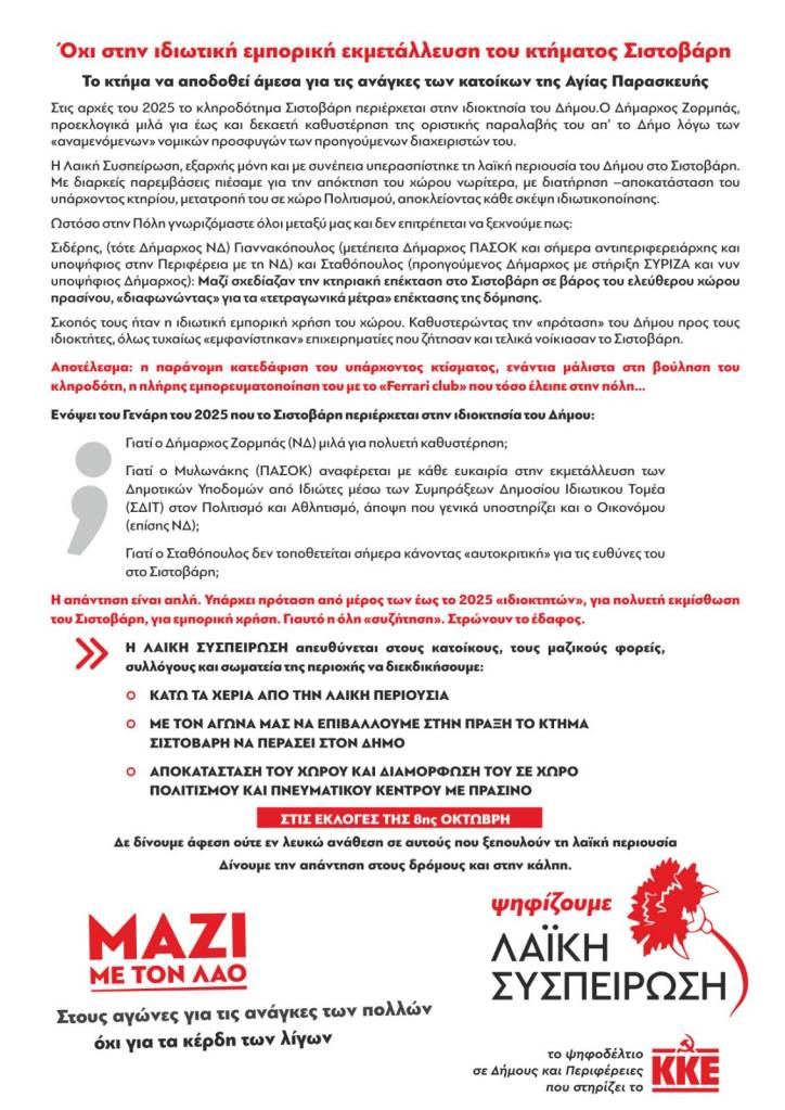 Η Λαική Συσπείρωση, εξαρχής μόνη και με συνέπεια υπερασπίστηκε τη λαϊκή περιουσία του Δήμου στο Σιστοβάρη