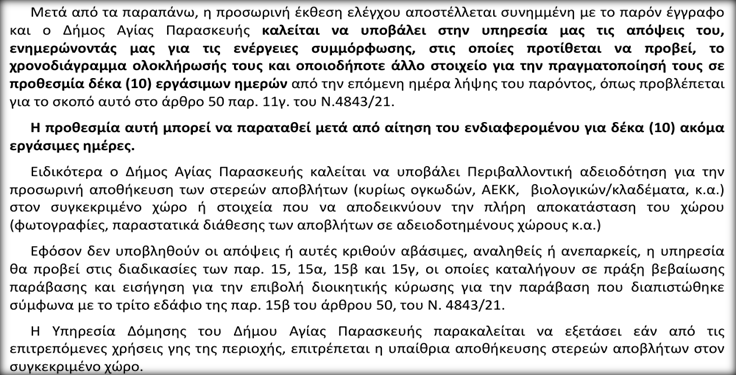 Στην παρακάτω προσωρινή έκθεση ελέγχου της Διεύθυνσης Περιβάλλοντος της Περιφέρειας Αττικής η Δημοτική Αρχή Μυλωνάκη καλείται σε απολογία εντός 10 εργάσιμων με δυνατότητα παράτασης για ακόμα 10 εργάσιμες με την προθεσμία να λήγει ΣΗΜΕΡΑ 9/1/2026. Συμπτωματικά (;) την επόμενη μέρα απ’ την οποία η Δημοτική Αρχή ξεκίνησε να ρίχνει μπετά…