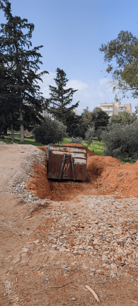 Προηγήθηκαν το τελευταίο διάστημα εργασίες διαμόρφωσης του χώρου (φωτό 1 -2 -3) που εκτός απ’ την προετοιμασία για τη σκυροδέτηση περιλάμβανε και εκτεταμένες εργασίες εκσκαφών για τοποθέτηση κάδων απόθεσης απορριμμάτων.