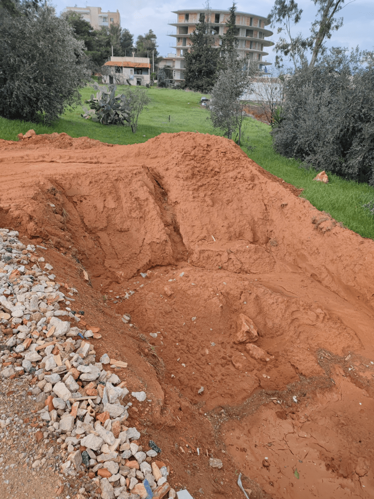 Άλλωστε την άθλια κατάσταση διαπίστωσε και το Τμήμα Ελέγχου της Διεύθυνσης Περιβάλλοντος της Περιφέρειας Αττικής με αυτοψία της την 28/11/2025 κατόπιν κλήσης από περίοικους λόγω της δυσοσμίας αλλά και λόγω των εκσκαφών που χωρίς ενίσχυση των πρανών δημιουργούν κινδύνους κατάρρευσης της μάντρας διπλανής κατοικίας (φωτό 7).